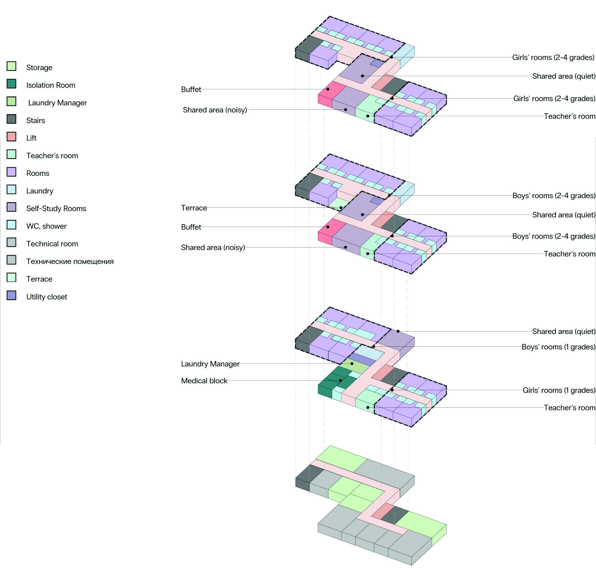 The primary and secondary school boarding facilities are designed with separate wings for boys and girls, as well as subdivisions based on age groups. A central common area on each floor is accessible to all residents and includes rooms for study and recreation, as well as a staff room for the dormitory supervisor. This arrangement helps minimize bullying and creates a safer and more comfortable living environment for the students.