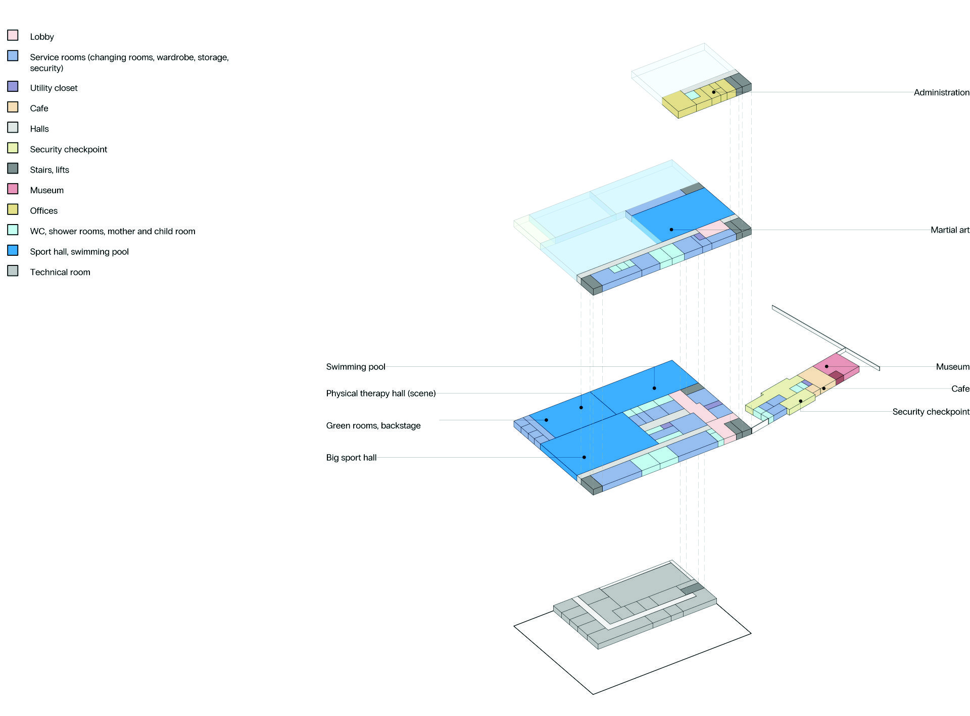 In addition, the project required the possibility of independent operation and controlled access to various functional zones (the sports and wellness complex with a stadium, boarding facilities, and the academic/research block), enabling their use by external visitors.