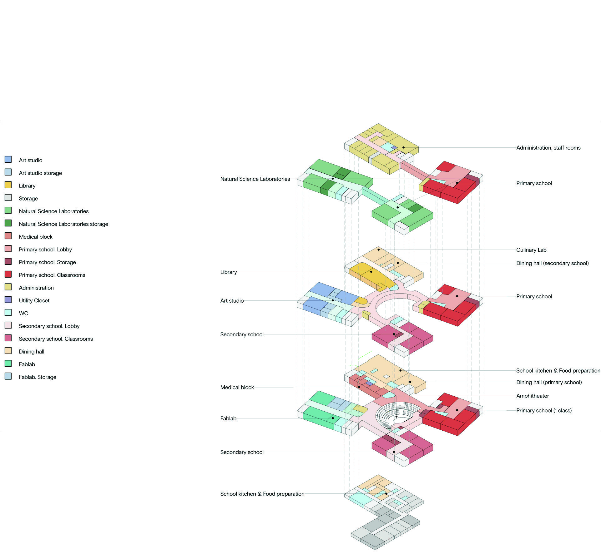 The school building accommodates educational units for primary school students, a secondary school teaching unit, the Natural Sciences Block, FabLab, and Arts and Music facilities. The Natural Sciences, FabLab, and Music blocks may be isolated to allow controlled access for external visitors.