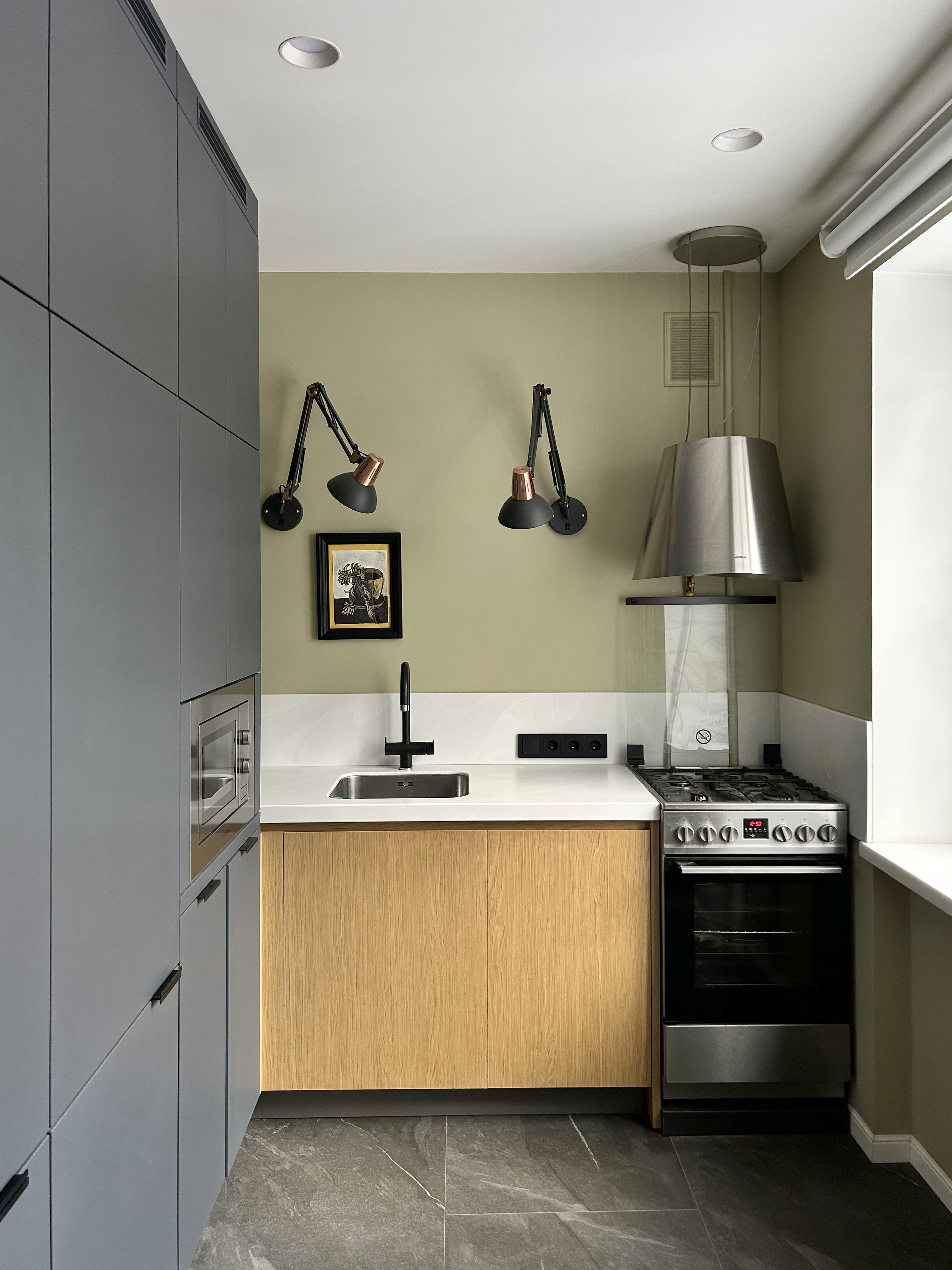 The palette is restrained yet expressive: soft olive tones, deep eggplant, and warm wood are complemented by emerald accents in the bathroom. The result is visual richness without excess. A carefully considered lighting scheme and a selection of contemporary art lend the apartment a timeless, creative atmosphere.