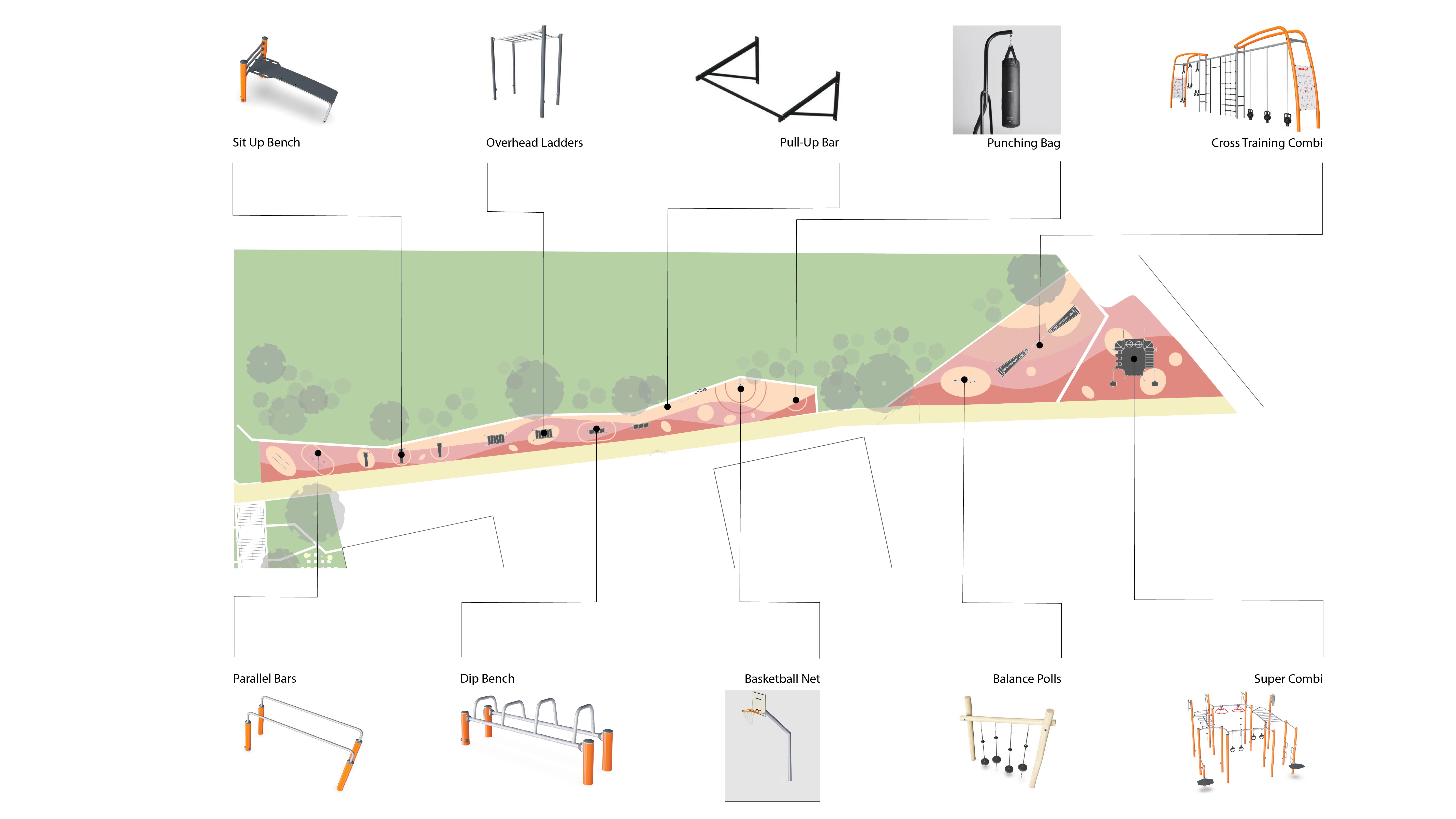 Outdoor sports facilities are located to the left of the main building and include a workout area, volleyball and basketball courts, bouldering, training zones, and equipment designed for adrenaline release and stress reduction.