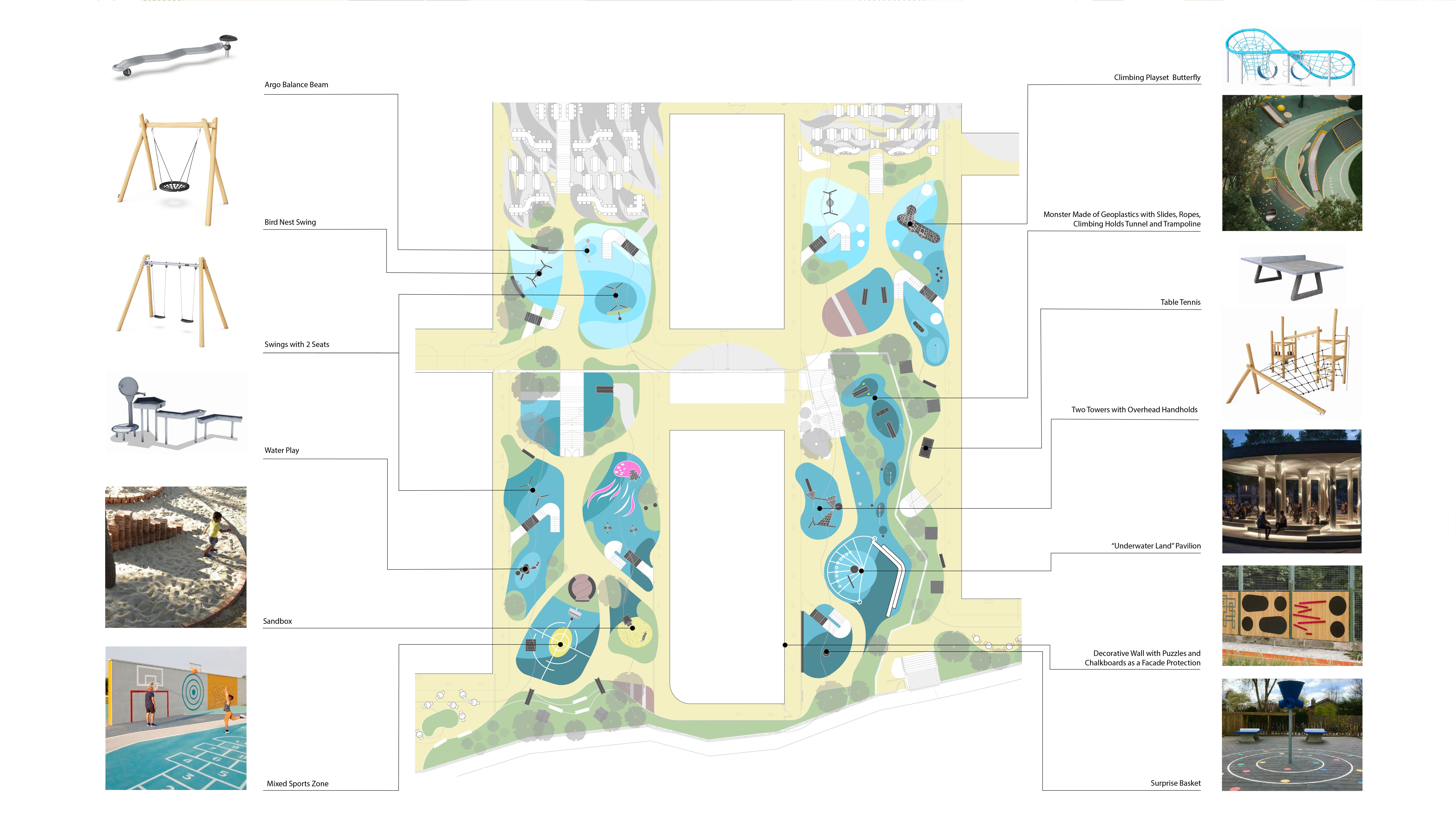 This zone consists of four playgrounds united by the common theme of the underwater, interpreting imagery of the water surface, sea foam, the ocean floor, and marine creatures. The unified concept creates a holistic and diverse play landscape, forming an emotionally rich environment that stimulates imagination and encourages exploration, interaction, and collaborative play.