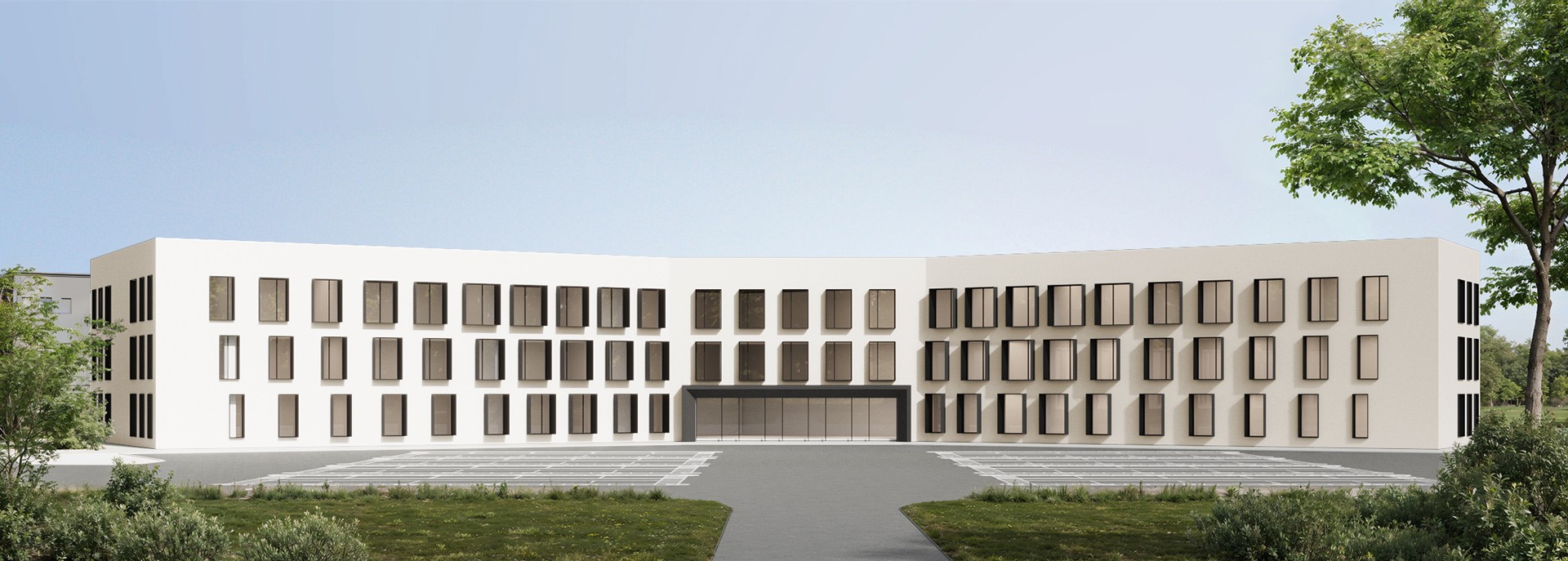 The “Gradient” option is characterised by frameless windows that gradually evolve into projecting window frames with increased depth. The strict minimalist façade comes alive through rhythm. The central entrance zone is emphasised by a portal and is easily legible.