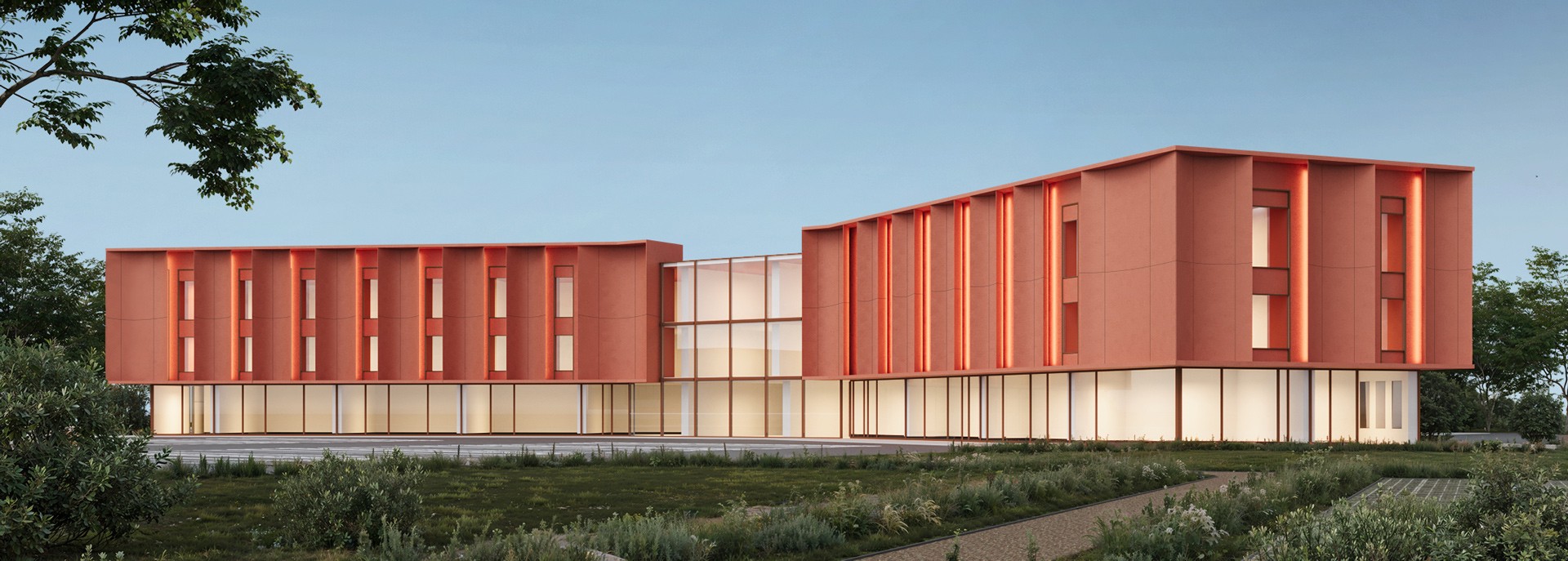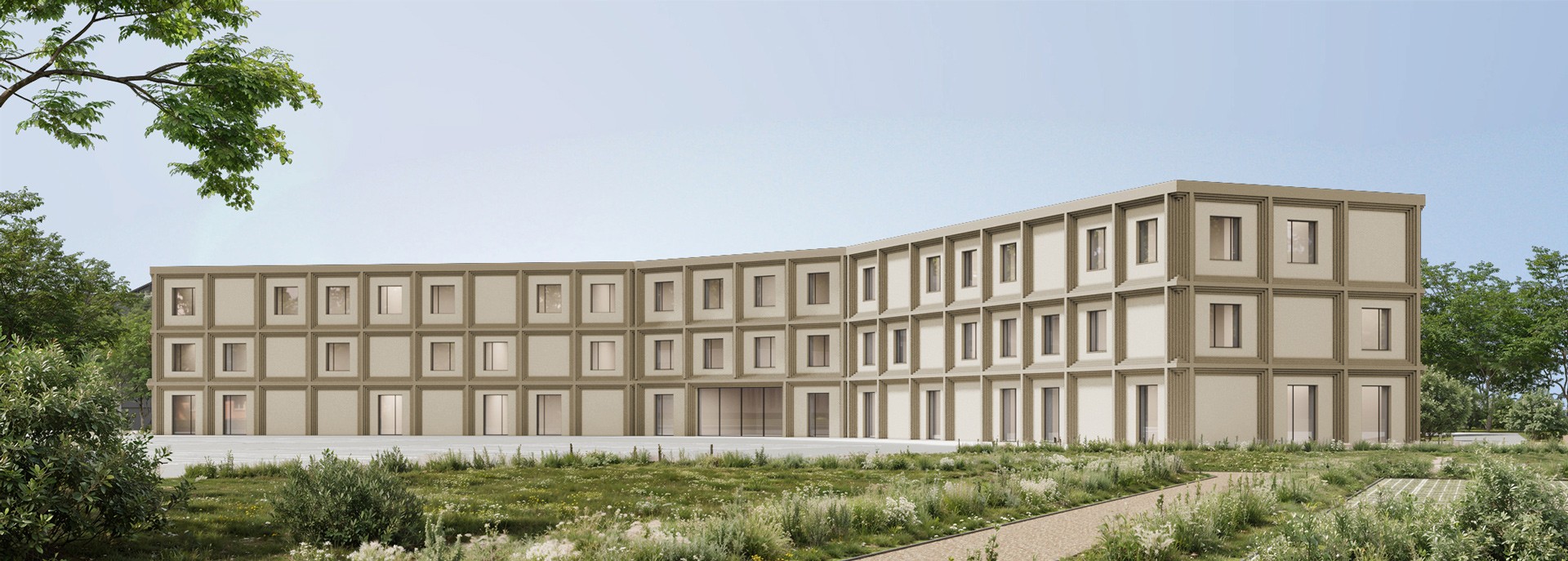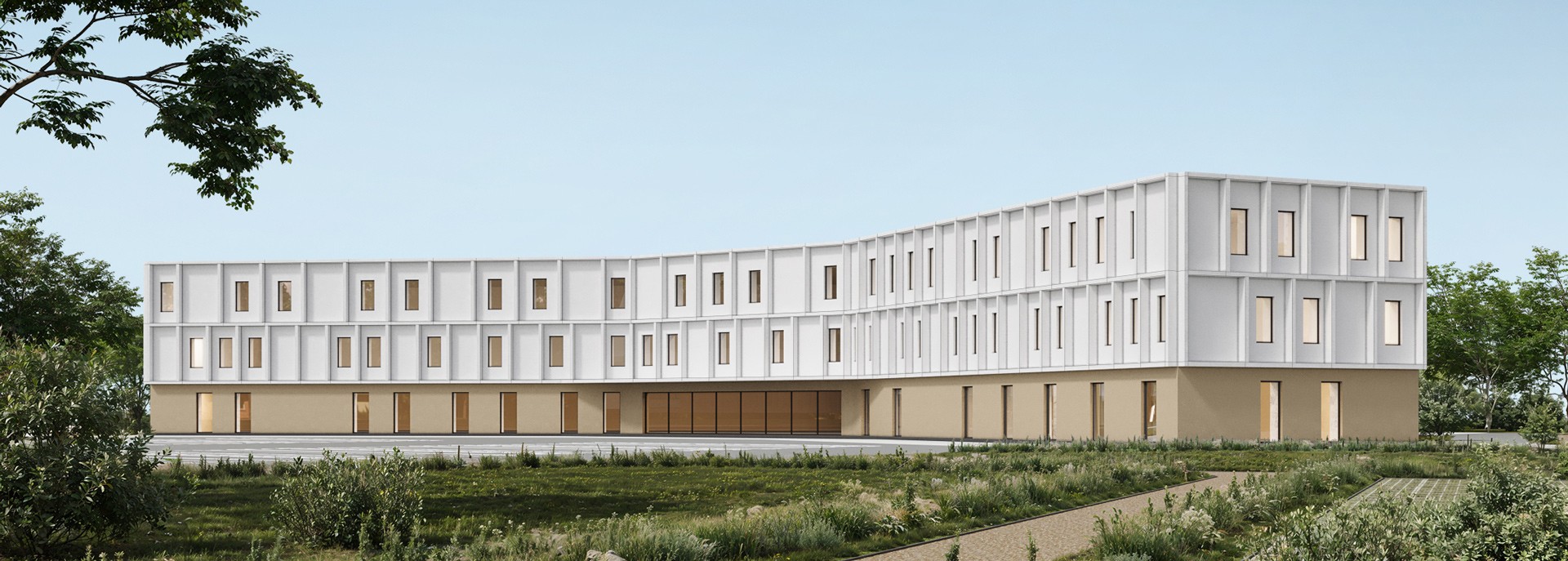 The façade we named “Grid” is designed as a structural mesh that envelops the school building. By accentuating the ground floor with colour, a proportional balance is achieved, making the building feel more human-scaled.