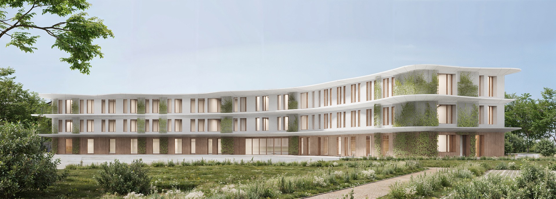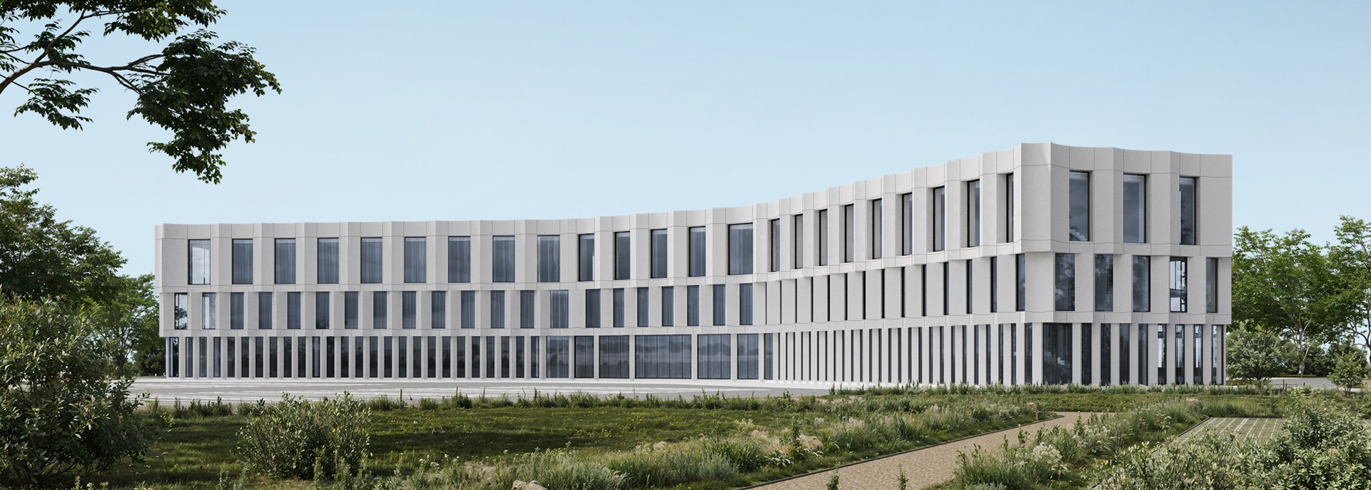 The expressiveness of the “Waves” façade is achieved through curved panel forms. The lightweight glazed portion contrasts with the more solid mass of the building. The colour scheme can be adapted.