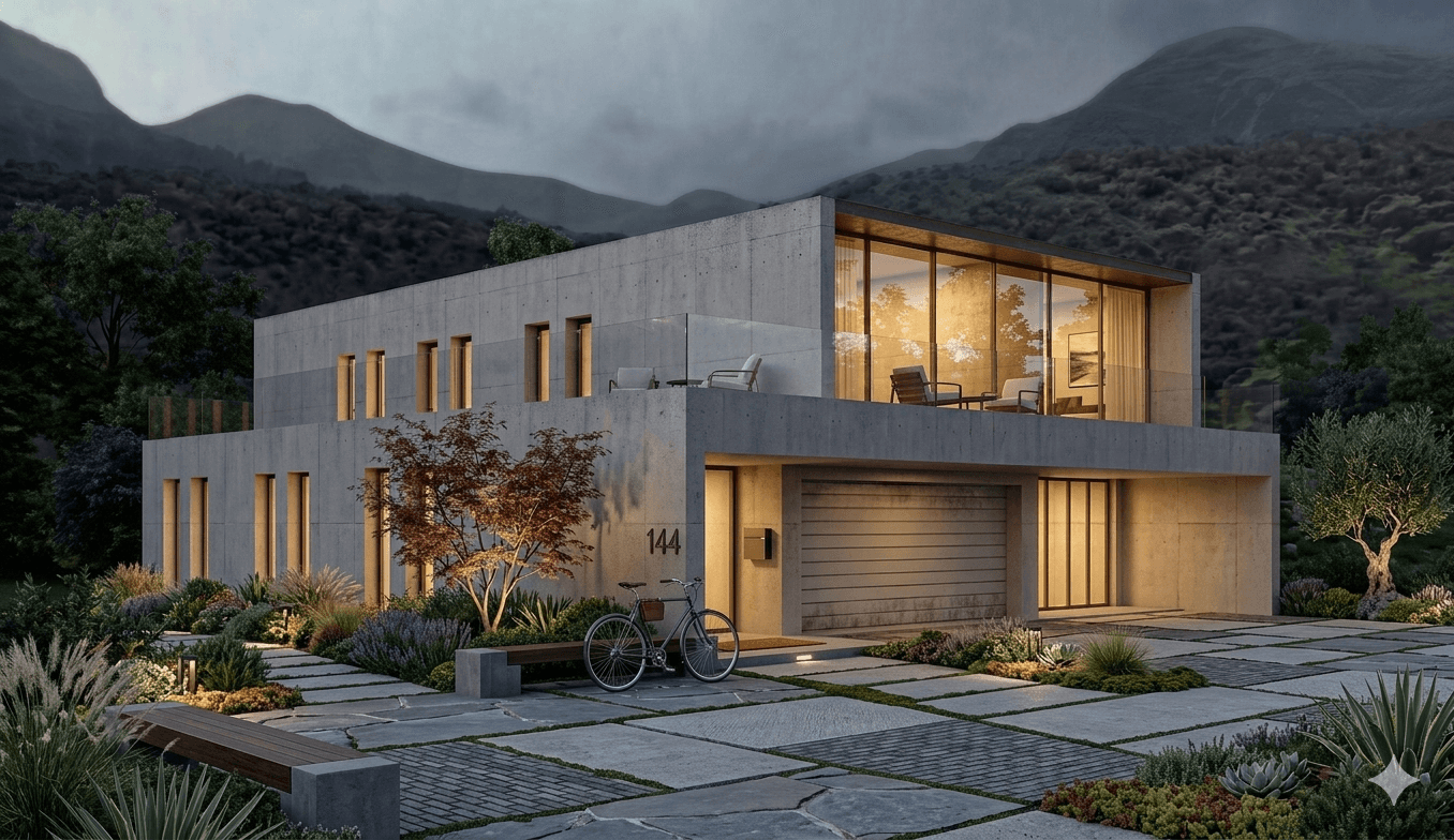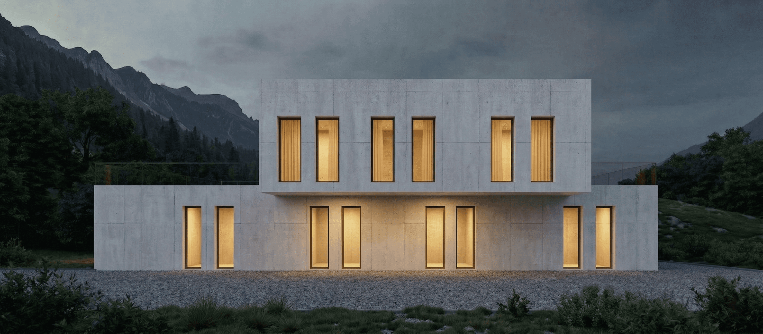 Architecturally, the house speaks in a restrained, contemporary language. Concrete and glass define its character — honest, composed, and of its time. Clean lines and clear volumes replace ornament, allowing material and proportion to take precedence.
