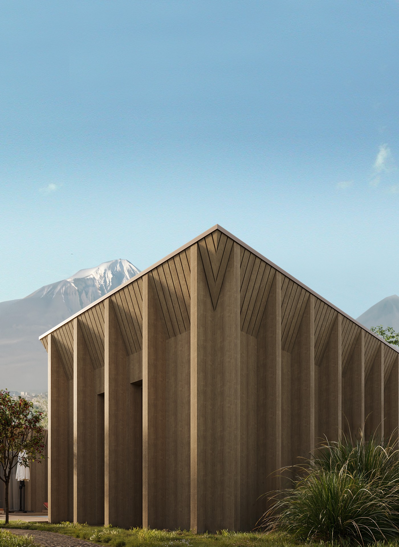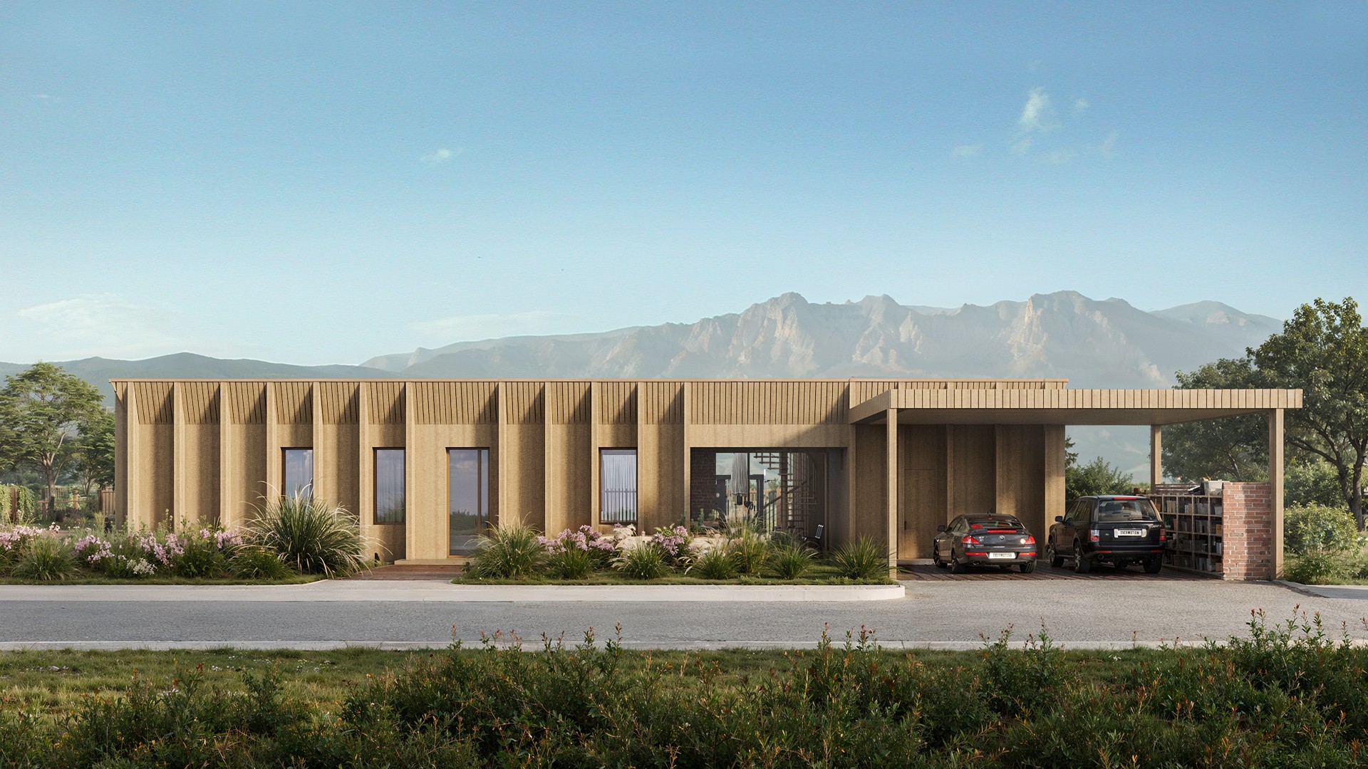 С дороги дом открывается не сразу. Сначала — зелень, тень, воздух. И только потом появляется само здание — спокойное, собранное, без лишнего жеста. Оно не спорит с окружением. Оно в нём живёт.