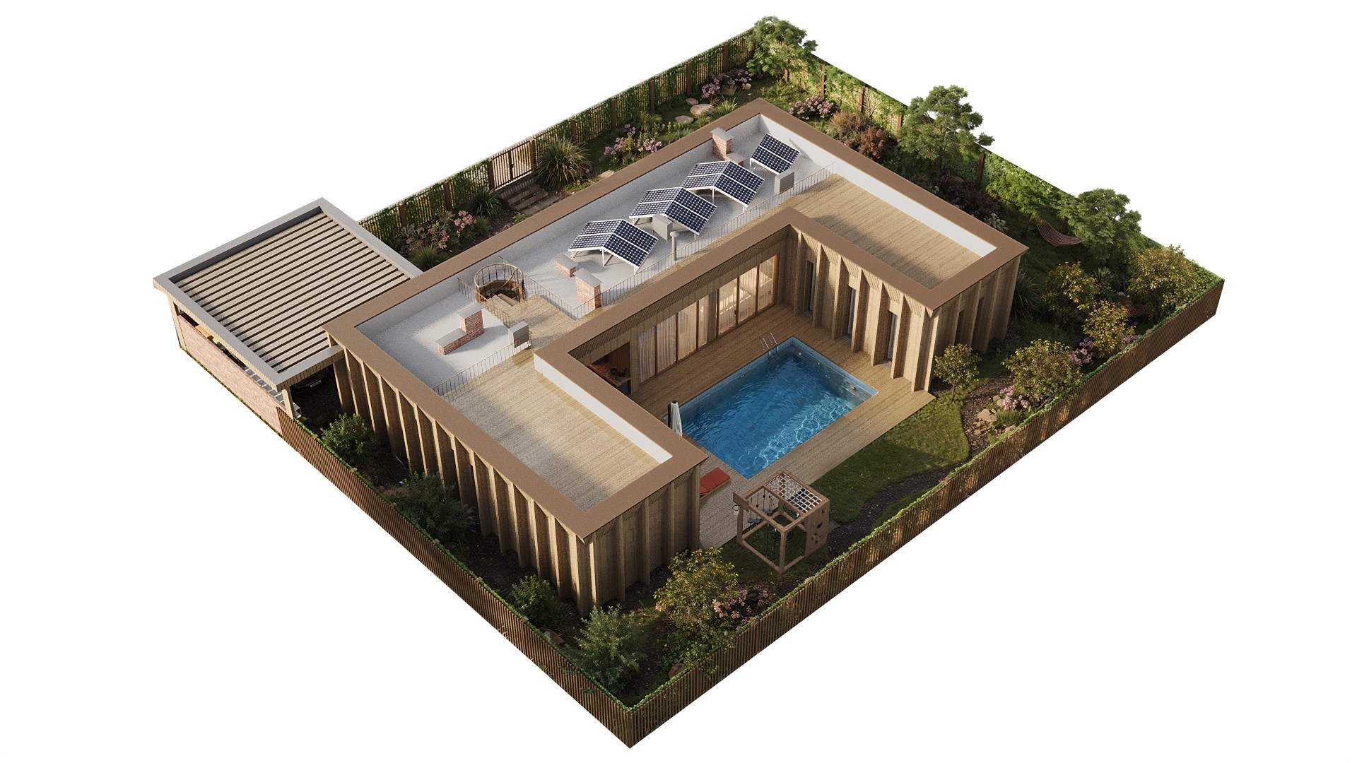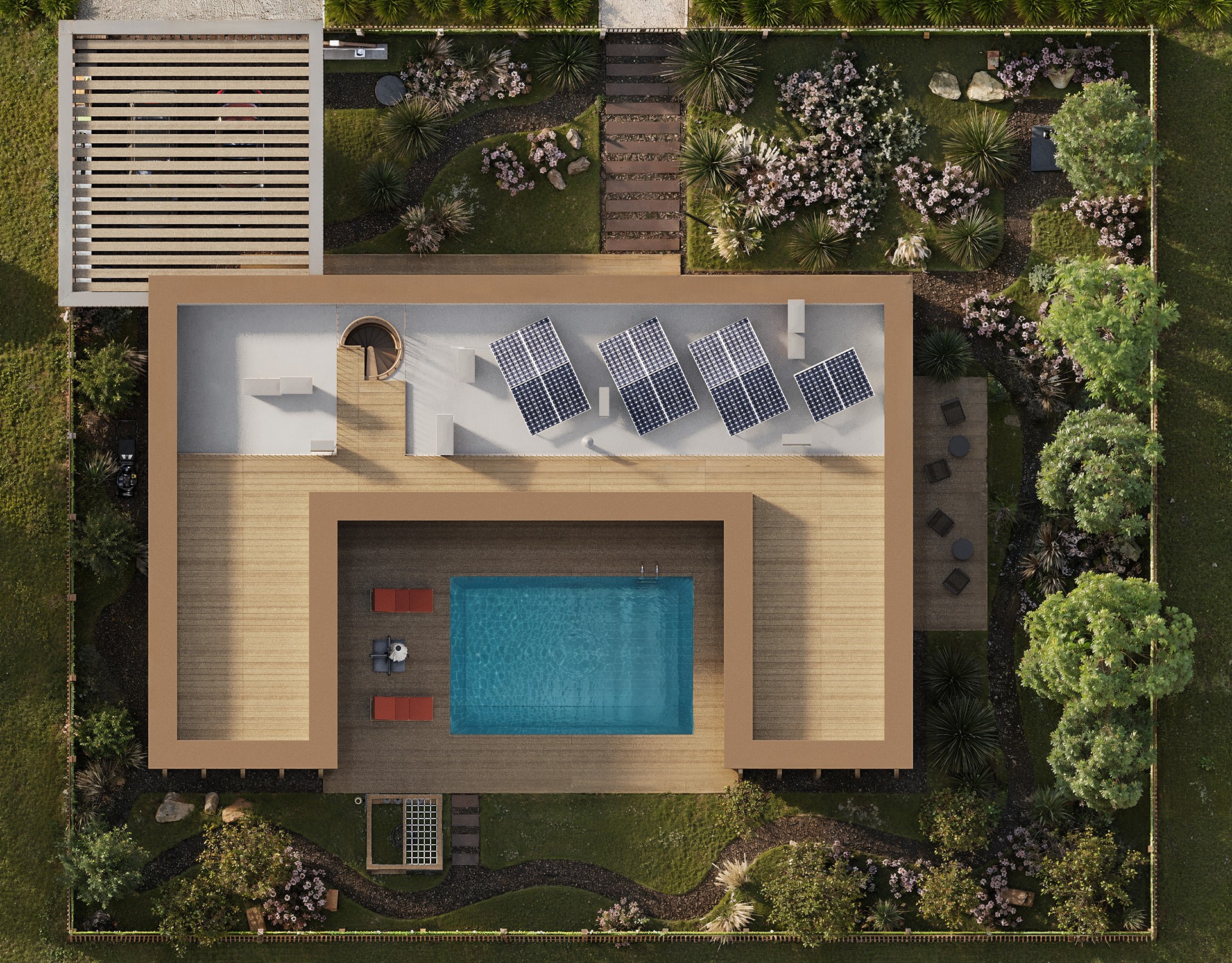 Дом связан с участком: из разных помещений есть выход к бассейну, который становится центром двора. Рядом расположен газон для отдыха и игр, предусмотрено место для детской площадки. Она находится в зоне видимости из кухни и гостиной, что удобно для повседневной жизни.