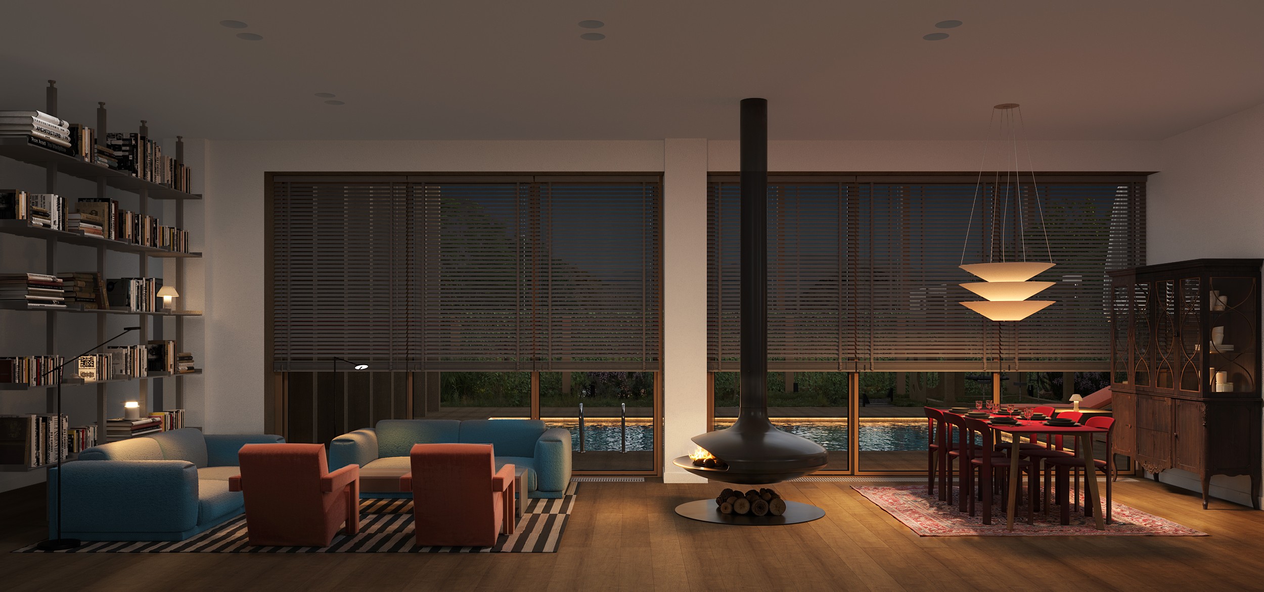 Просторная кухня-гостиная — сердце дома. Здесь удобно собираться всей семьёй, проводить вечера, принимать гостей. Дровяной камин деликатно разделяет кухню-столовую и зону отдыха, сохраняя общее пространство единым. Из гостиной виден внутренний двор с бассейном и садом — визуально дом продолжается за пределами стен.
