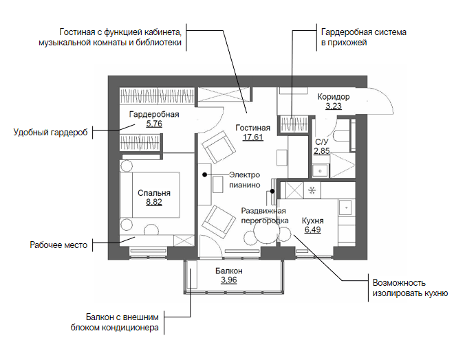 Из гостиной также есть доступ в спальню через вместительный гардероб — место, где найдется место для одежды и всех бытовых мелочей.