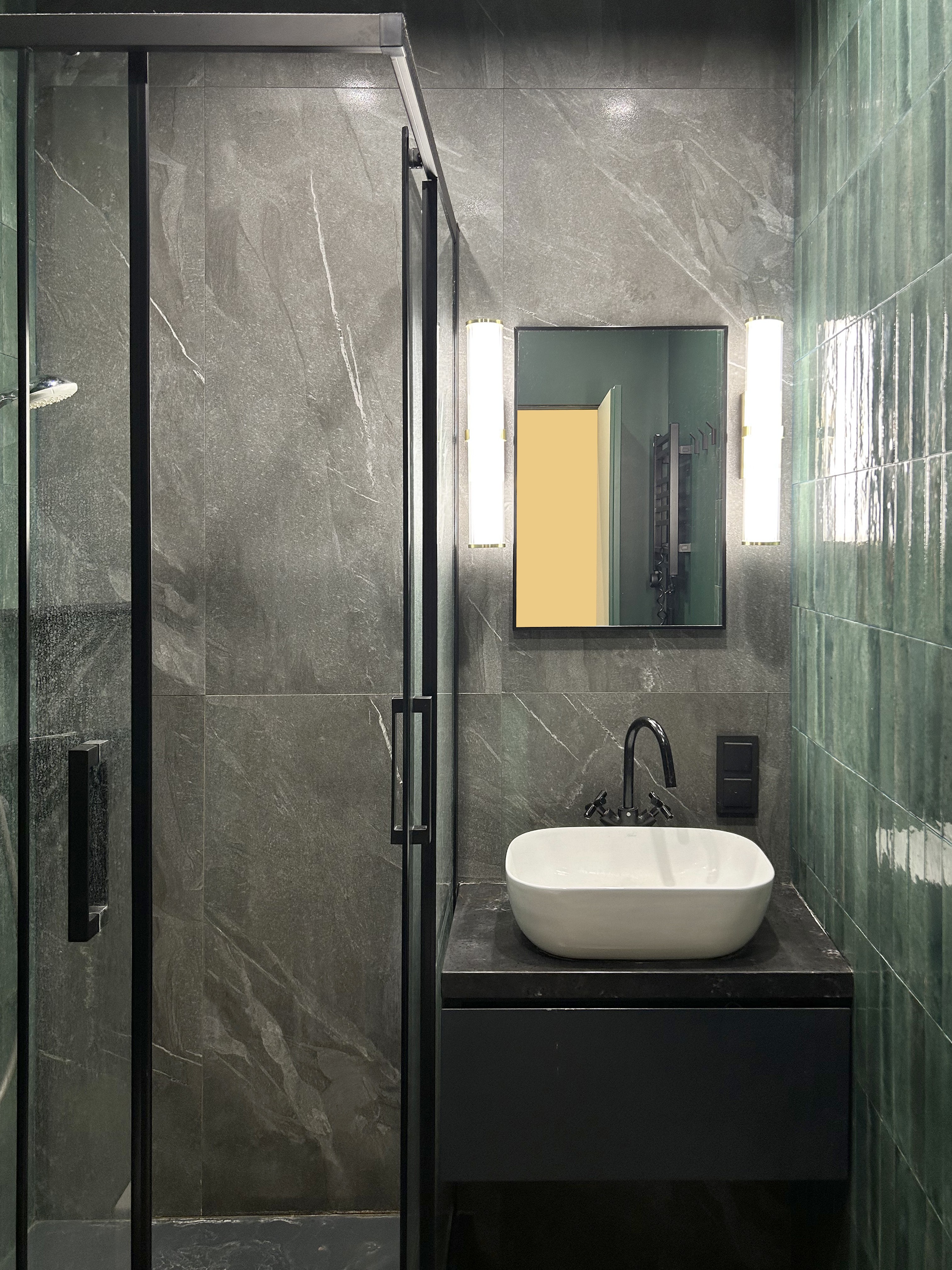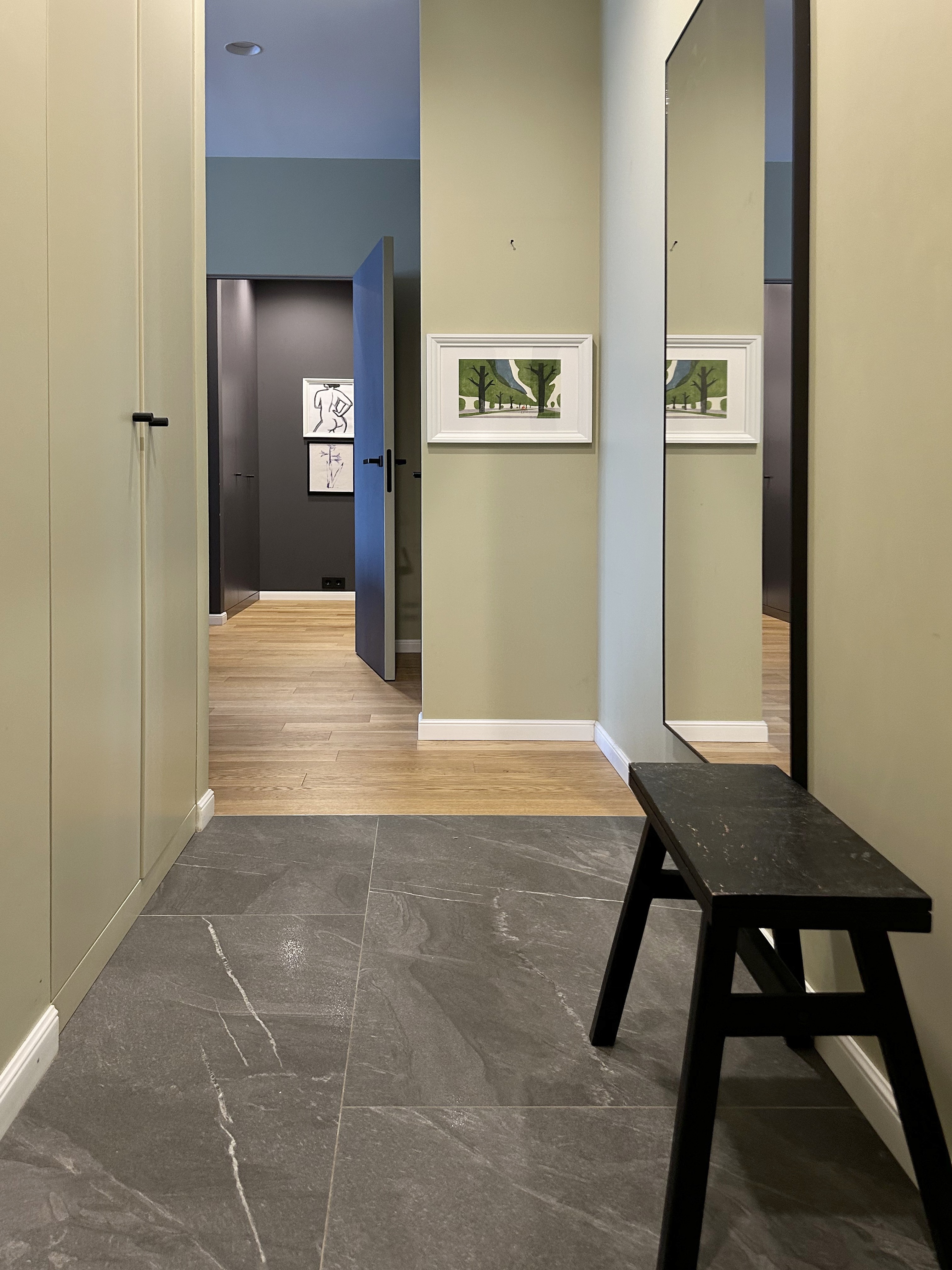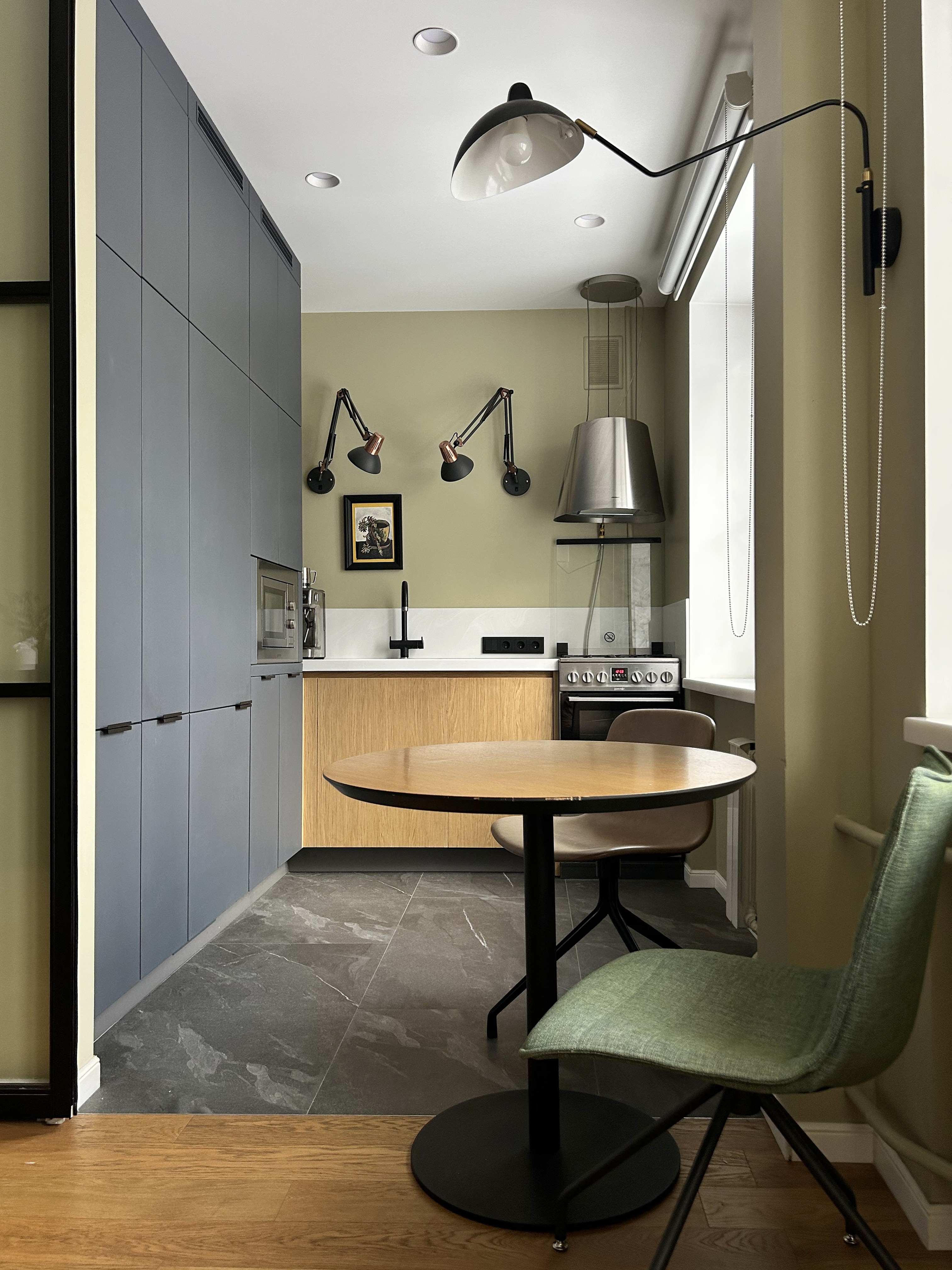 В квартире используется сдержанная цветовая гамма — пастельного оливкового, баклажанового и дерева, с акцентными вставками изумрудно-зеленого в ванной комнате. Это создаёт визуальное разнообразие, не перегружая интерьер. Продуманный световой дизайн квартиры, тщательно подобранное современное искусство создает атмосферу творческого пространства вне времени.