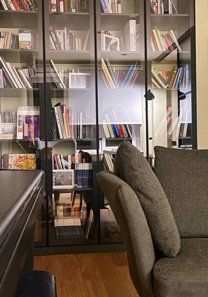 Дальше открывается просторная гостиная, в которой органично сочетаются сразу четыре функции: зона отдыха, кабинет, библиотека и музыкальная комната. Небольшое рабочее место и электрическое пианино создают атмосферу творчества и уюта, наполняя пространство живой музыкой и мыслями.