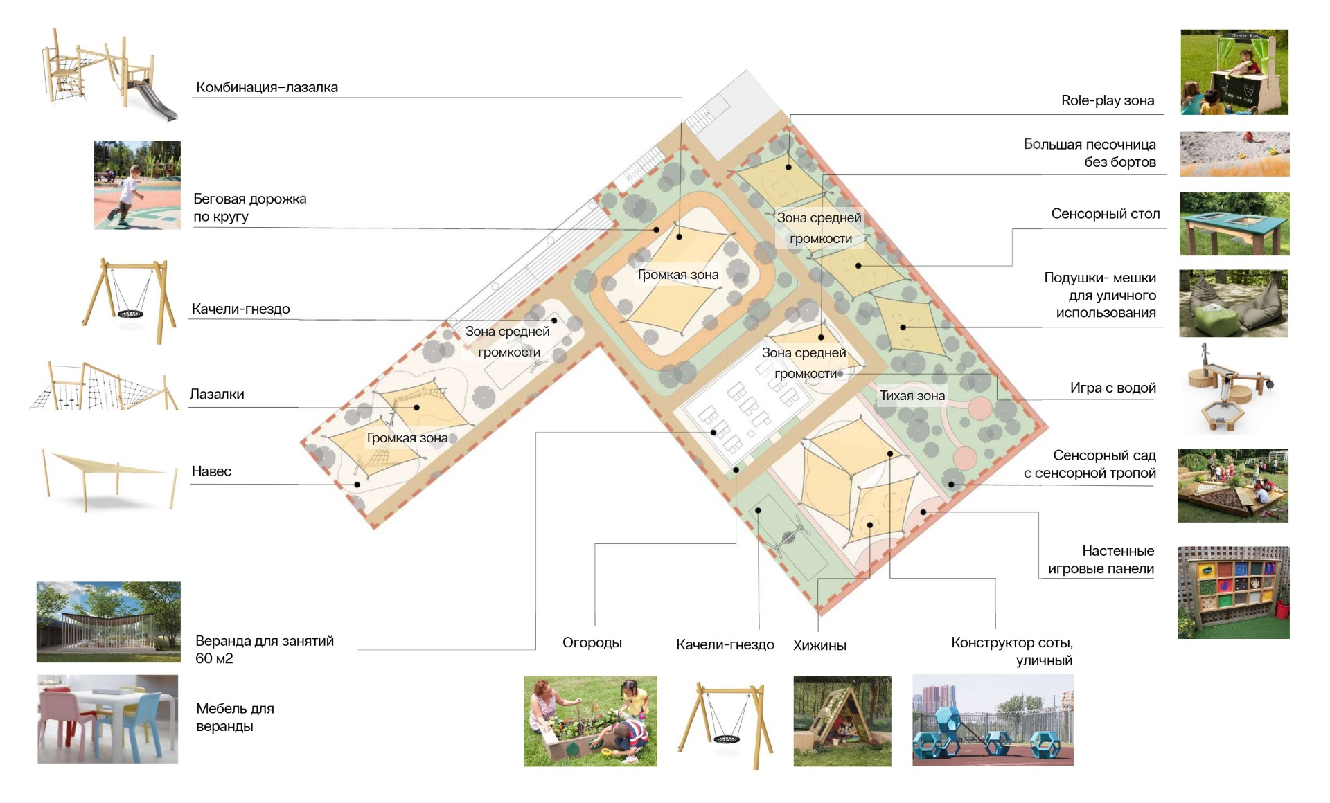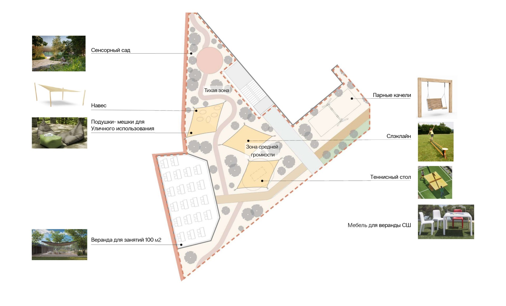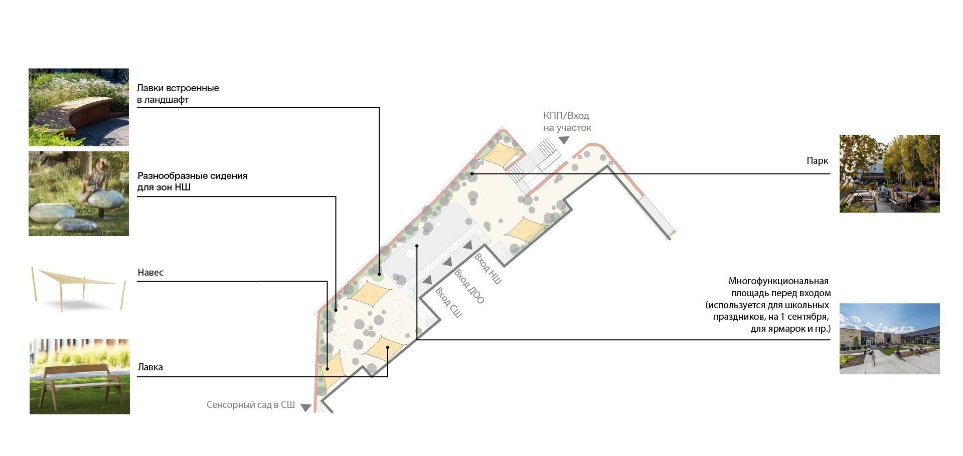Мы спроектировали не просто то, что требовалось в изначальном ТЗ, но создали зоны, которых не было в исходном брифе, крытые перголы для проведения занятий на свежем воздухе, тихую зону для проведения как открытых уроков на ней, общих чтений, так и медитаций, зону амфитеатра, зону ярмарок у входа, которая является частью парка и в обычное время используется как уличное кафе, развели потоки посетителей и пользователей, что важно для детского сада и начальной школы.