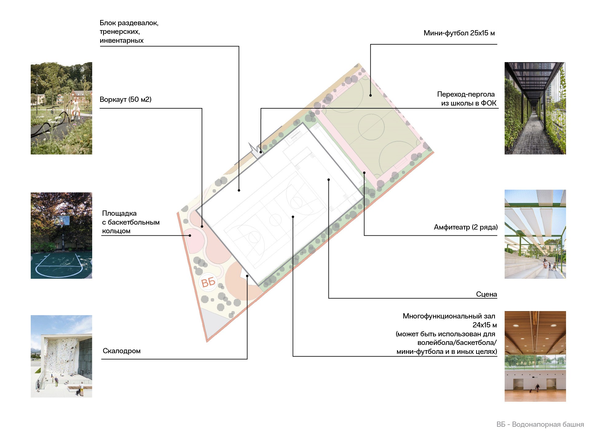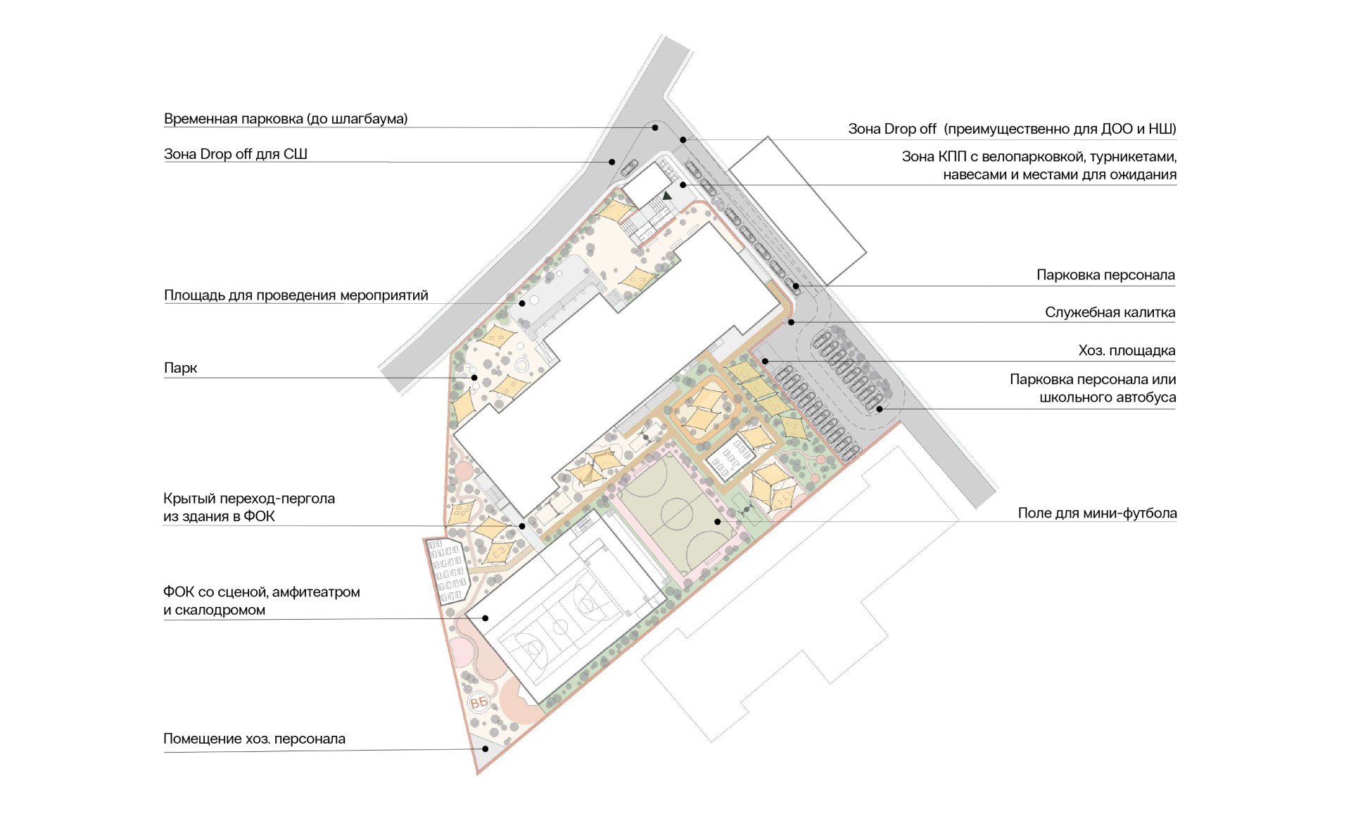 Для этого в концепцию пространственного решения была заложена многофункциональность зон, что повысило эффективность пространства. Все архитектурные решения были адаптированы под климатические условия: сделаны выносные консоли у ФОКа, добавлены зоны с зелеными навесами и озеленение на фасад, сделана зона ожидания с навесом у КПП, и на всех игровых зонах установлены навесы и зоны игры с водой.