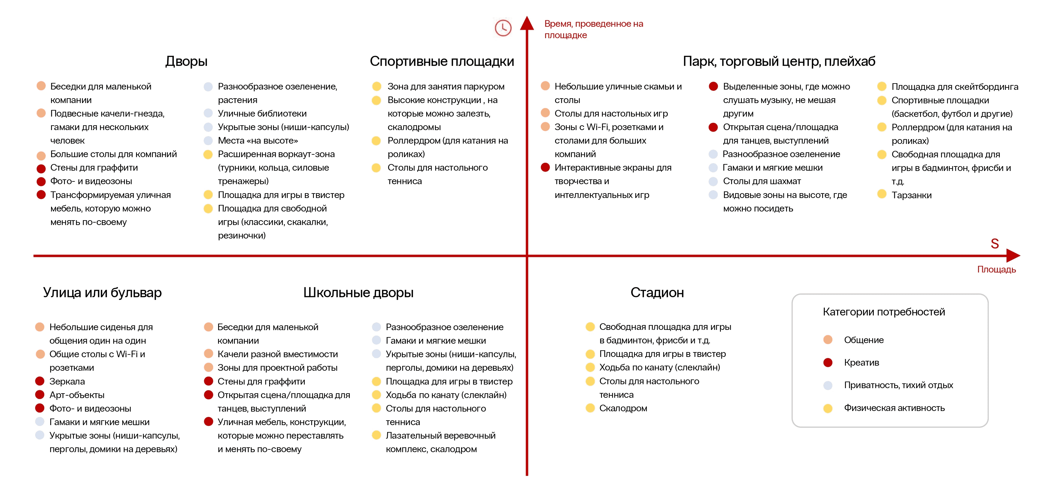 Площадки нужно разделять на зоны для использования подростками с разными интересами, темпераментами, чтобы комфортно чувствовали себя все;