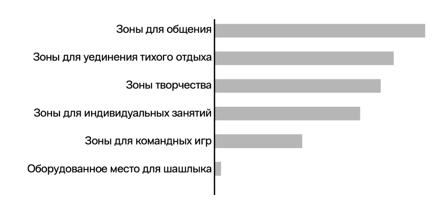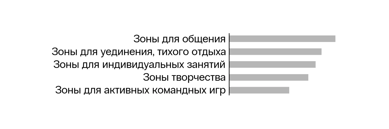 Предусматривать зоны для общения разного количества человек, от небольшого места для разговоров один на один, до стола для больших компаний и проектной работы. Места, например, амфитеатры, где можно высказаться на большую аудиторию;