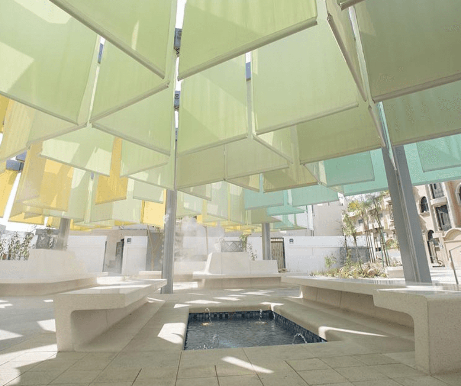 В жарких регионах стоит предусмотреть элементы, которые обеспечат тень на игровой площадке: навесы, перголы или деревья. Так же понизить температуру поможет использование ландшафтных бассейнов и фонтанов, систем туманообразования.
