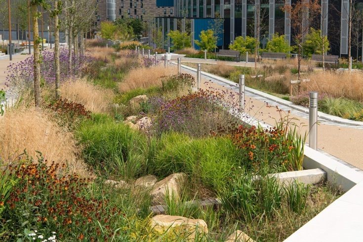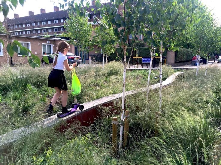 Для защиты игровых площадок от дождя необходимо обеспечивать дренажные системы, проницаемые материалы мощения для отвода воды с площадки. Дождевые сады помогут не только собрать воду, но и зонировать пространство площадки.